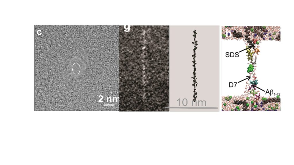 Above: (left) A schematic cutaway of a single molecule biotin-A𝛽1−42 peptide, tethered to the tip of an AFM cantilever (center) Concomitant measurements of the force and current are shown as a single, biotin-A𝛽1−42 molecule was pulled once through a sub-nanopore (right) A kymograph of the AC current is shown that represents a compilation of autocorrelation functions.