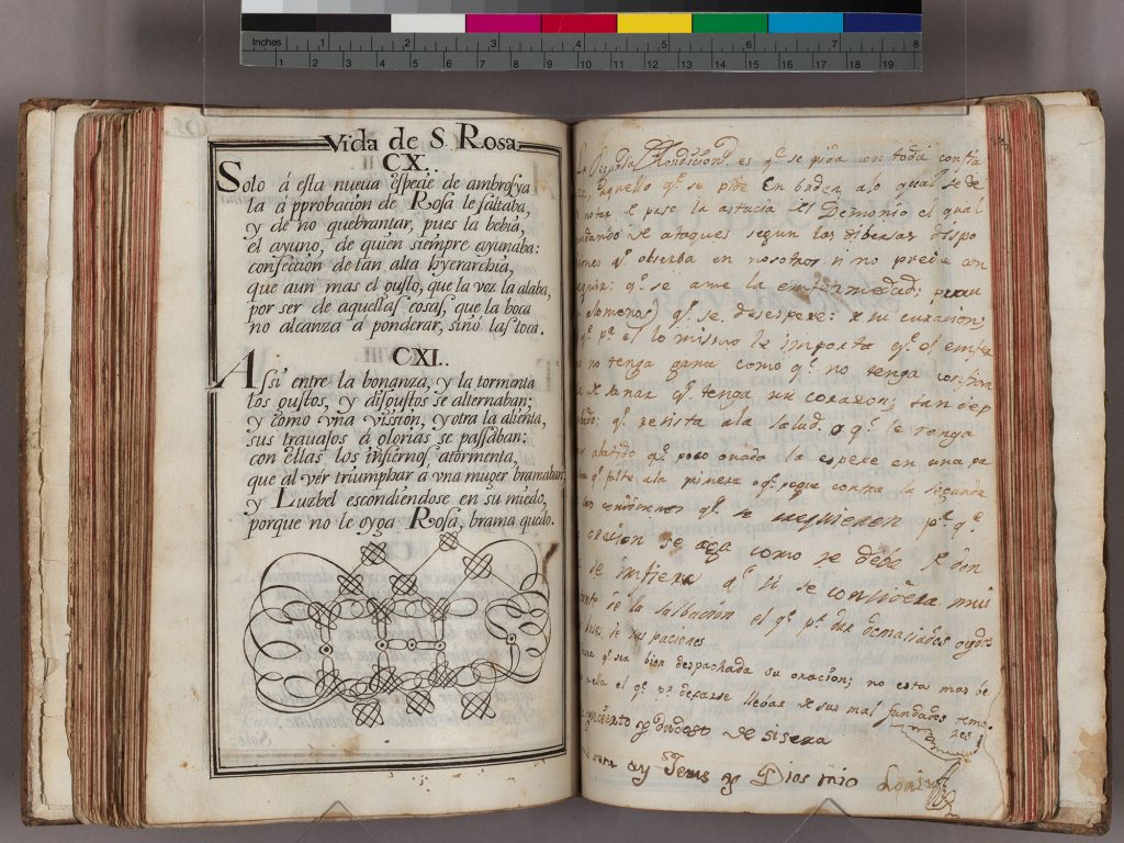 AEO: What surprised me the most were two handwritten volumes written by authors from the 17th century in the Viceroyalty of Peru. One is titled “Life of Saint Rose,” and it is actually called Life of Saint Rose of Saint Mary, native of Lima and patroness of Peru. Heroic Poem. It’s indeed an epic poem, written in ottava rima (as was standard), and it’s a fascinating piece that runs to 11,300 verses. The author, Luis Antonio de Oviedo y Herrera, was the magistrate (corregidor) of the Imperial City of Potosí, and while there he organized the festivities for the canonization of Saint Rose in 1672. Two 18th-century editions of the poem are known: one from Madrid (1711) and one from Mexico (1729). The manuscript used for the 1712 edition is housed at the Fundación Lázaro Galdiano. In Mexico, a separate manuscript wasn’t needed since they simply followed the Madrid edition exactly, with the same text layout per page. That’s what they logically did. But here, in Rare Books, we found another manuscript with a different textual layout, which, as far as we know, was never published. It’s surprising, authentic—a real rarity—and I’m determined to work on it.