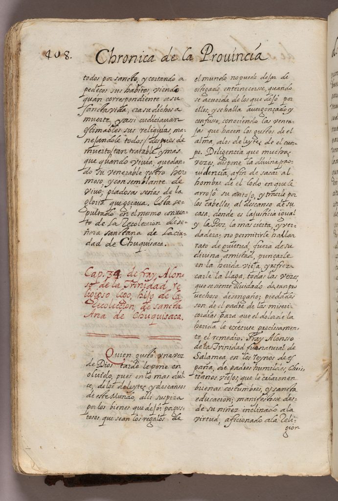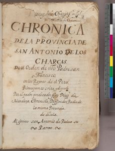 The other find is a manuscript of over 800 pages. It’s the Chronicle of the Province of Saint Anthony of Charcas of the Order of Our Seraphic Father Saint Francis…, written by Fray Diego de Mendoza. The author is believed to have been born in Cusco, and we know he wrote the chronicle in a convent in that city. It’s an imposing work, full of scholarly references, consisting of three books. It was written primarily for edification: after presenting in the first book the general history of the Franciscan order in the Americas, and particularly in the province of Charcas (roughly what is now Bolivia), books II and III are devoted to presenting the “life and virtues” of a great many people—men and women, Spaniards, Creoles, and Indigenous people—who belonged to the Franciscan order (perhaps more accurately, “orders” in the plural).