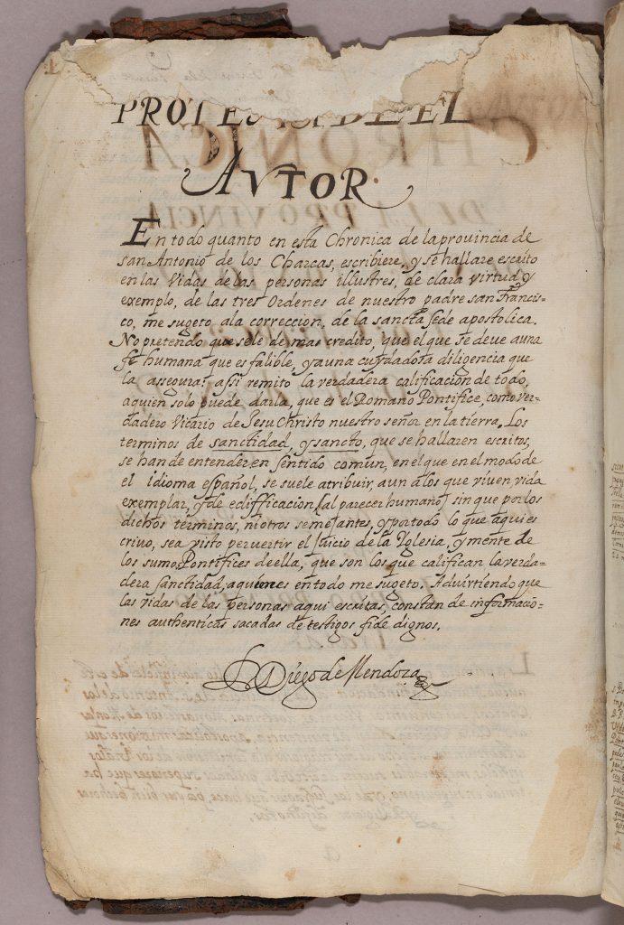 El otro hallazgo es un manuscrito de más de 800 páginas. Es la “Chrónica de la Provincia de San Antonio de los Charcas del Orden de nuestro Seráfico Padre San Francisco …”, escrito por fray Diego de Mendoza. Se cree que el autor nació en el Cusco, y sabemos que escribió la crónica en el convento de esa ciudad. Es una obra imponente, con muchas referencias eruditas, que consta de tres libros. Está escrita principalmente para la edificación: después de exponer, en el libro primero, la historia general de la orden en América y particularmente en la provincia de Charcas (que coincide aproximadamente con lo que hoy es Bolivia), los libros II y III los dedica a exponer la “vida y virtudes” de una gran cantidad de personas, varones y mujeres, españoles, criollos e indios, que pertenecieron a la orden religiosa (tal vez sea más exacto decir “órdenes”, en plural) de los franciscanos.